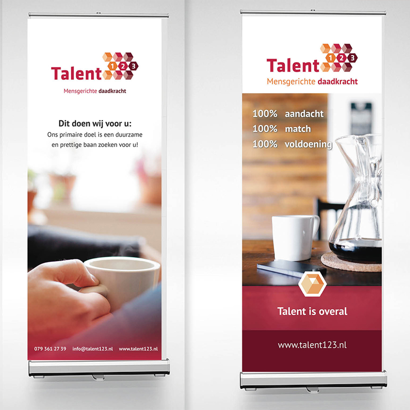 Voor Talent123 ontwerp ik diverse grafische uitingen zoals auto bestickering, roll up banners, stickers en kalenders. Hiernaast is het ontwerp voor de roll up banners te zien. De klant gebruikt de rechter banner bij binnenkomst van het bedrijfspand. Het linker ontwerp is één van de andere voorstellen die naar de klant is gestuurd.