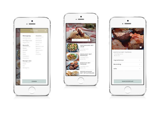 Bij de interactieve kookplaat hoort een app. In de app kan de gebruiker alle voorbereidingen treffen die nodig zijn om een maaltijd/recept te koken. Zo kan de gebruiker recepten zoeken, zijn of haar voorkeuren aangeven om het zoeken gerichter te maken en om rekening te houden met bijvoorbeeld allergieën. Bij een recept staat aangeven wat de benodigde ingrediënten zijn en is het mogelijk het recept naar de kookplaat te versturen. Bekijk hier het prototype van de app.