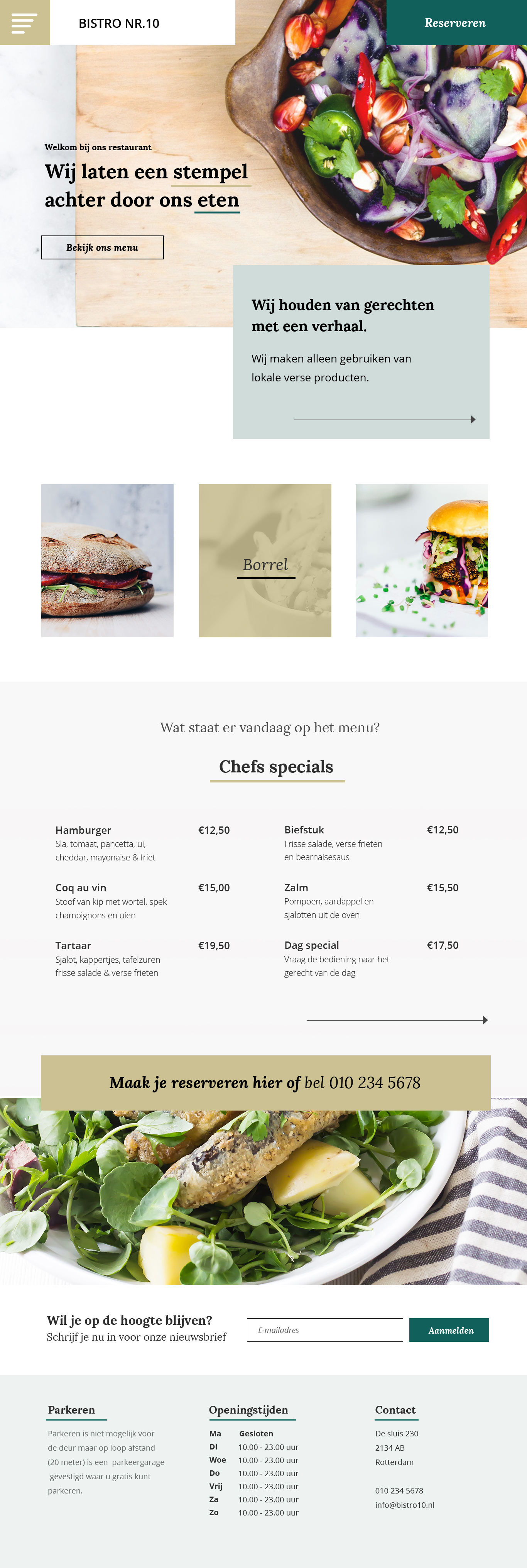Naast mijn werk ben ik constant bezig om mijn grenzen te verleggen om hiervan te leren. Zo is ook het ontwerp van deze website ontstaan. Ik wilde graag een website ontwerpen voor een restaurant. Vanuit dit idee is de het ontwerp zoals hiernaast weergegeven ontstaan.